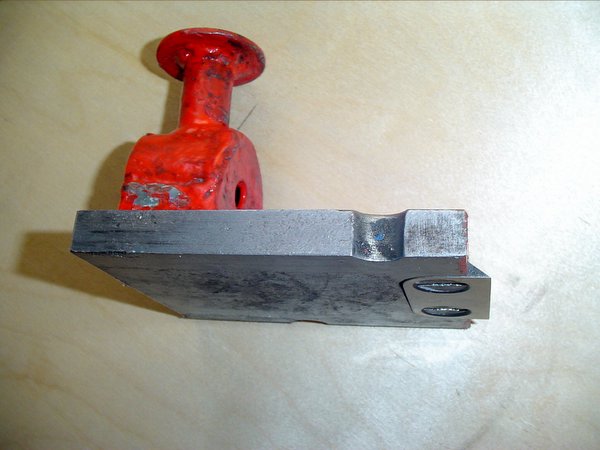 Abb. 1.3b: Das angeschliffene Messer ist in den Block der Kappvorrichtung eingelassen, um die beim Auftreffen auf den Messingklotz auftretenden Kräfte aufzunehmen. |